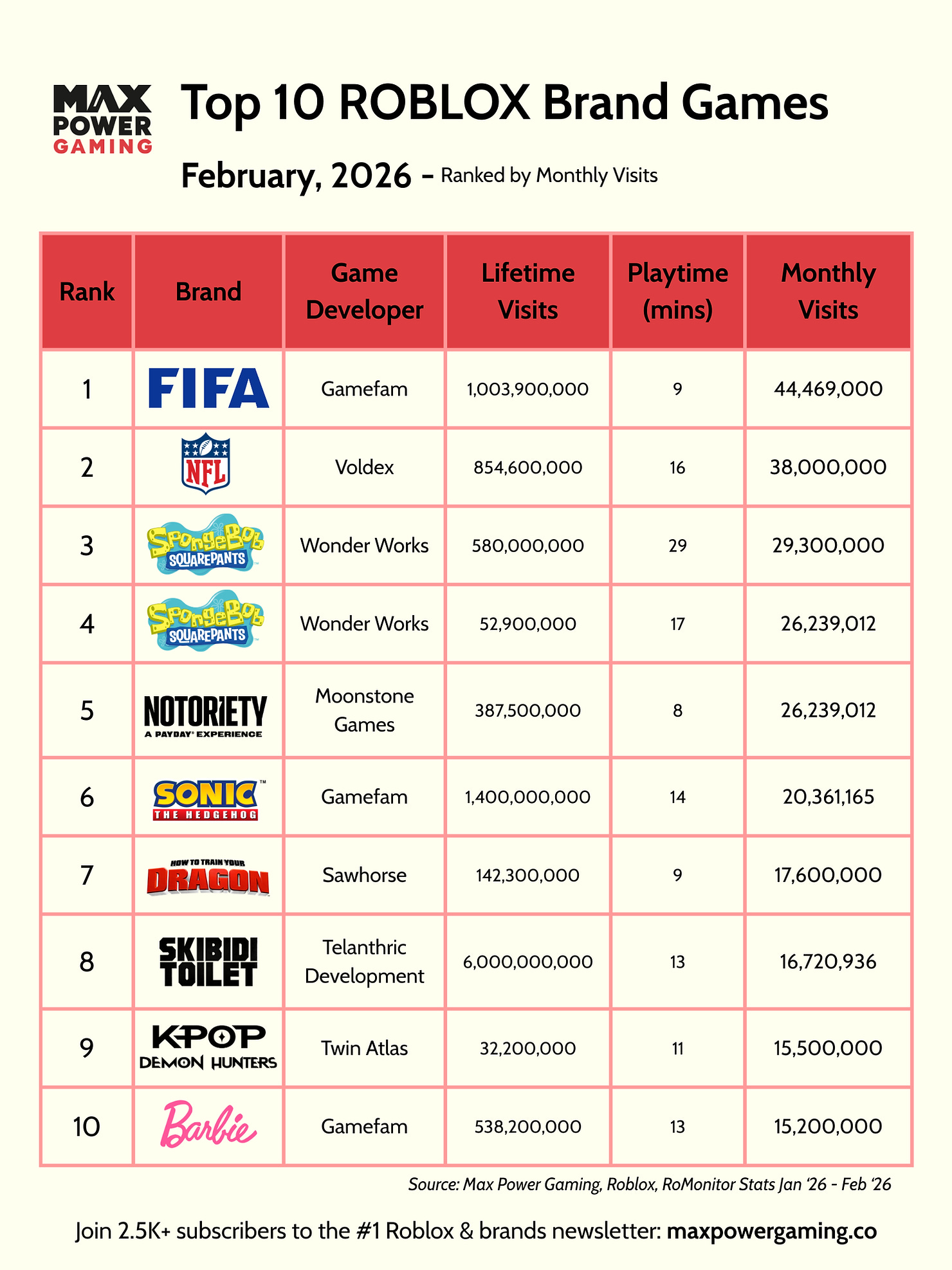 While user-made mini games dominate Gen Zâs time on Roblox, FIFA took the route of purchasing and rebranding the existing âSuper League Soccerâ to shoot themselves to the top of the branded games list. The game already averaged nearly 10M monthly users and 1.5M daily plays - but in January alone, it had 44M visits under the new name. This isnât FIFAâs first time in Roblox - their 2022 World Cup activation drew over 26M visits - but itâs a deeper integration thatâs yielding more engagement, especially ahead of the highly anticipated 2026 World Cup. Other brands have taken this same path of purchasing an existing game, including NASCAR and the NFL, the latter of which has the second most-visited game this month. While essentially side-stepping building up a brand-new game, this strategy is proving to create more permanent brand visibility in one of Gen Zâs favourite games. (Max Power Gaming)